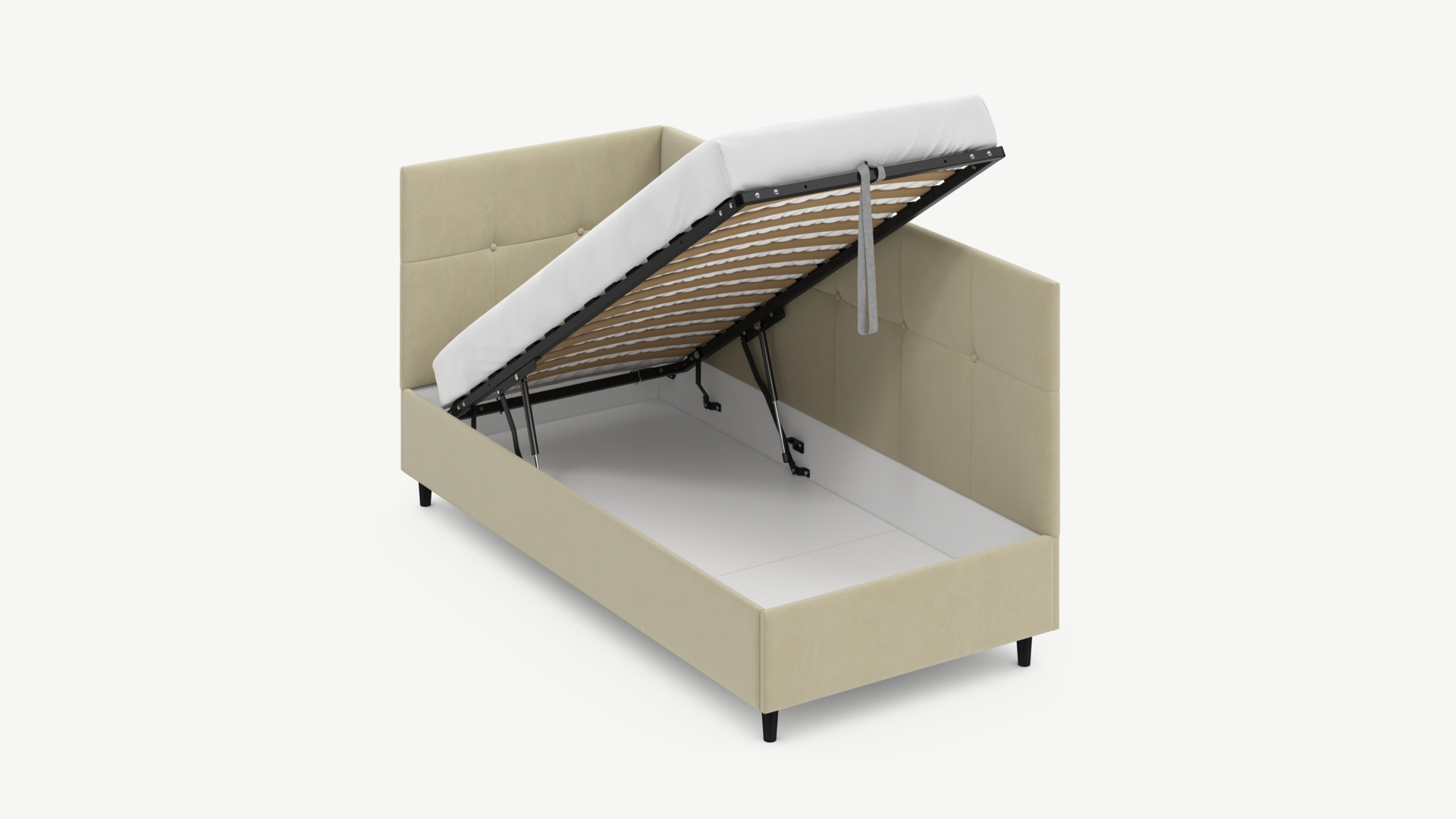 • Скрытая под основанием вместительная емкость без внутренних перегородок позволяет использовать всю площадь подкроватного пространства для хранения вещей.